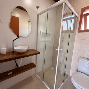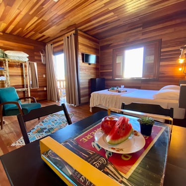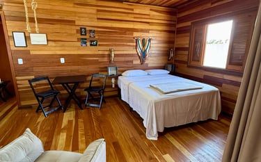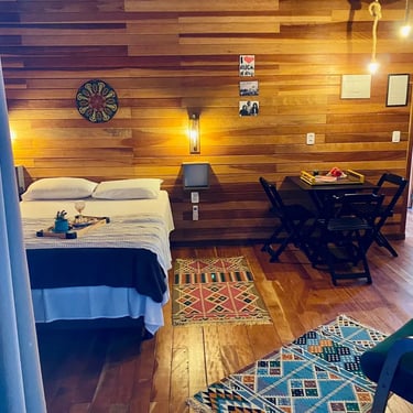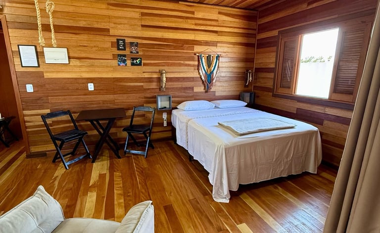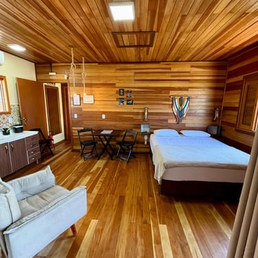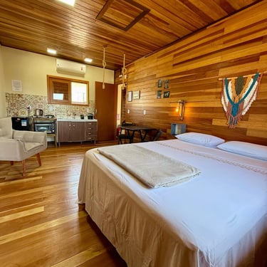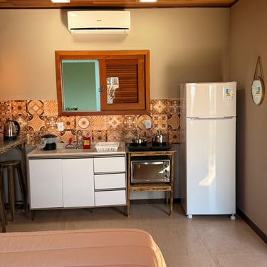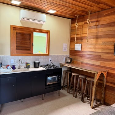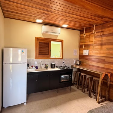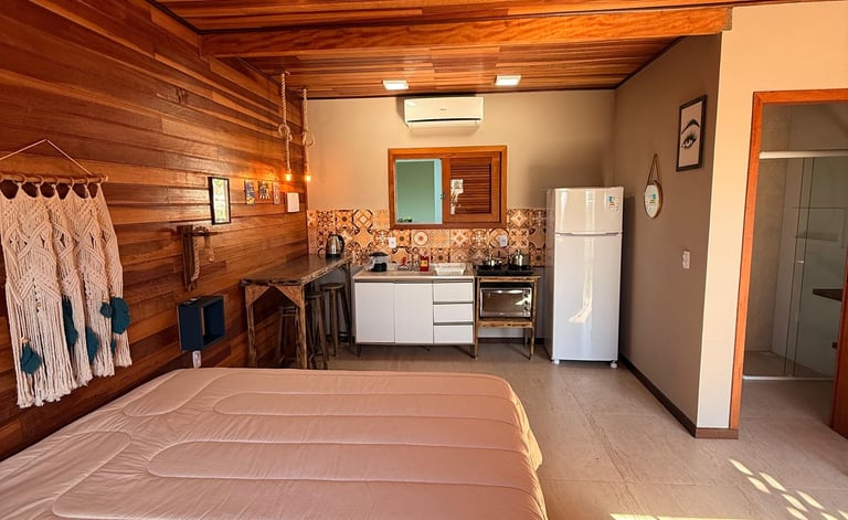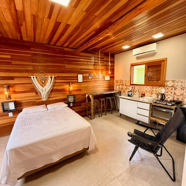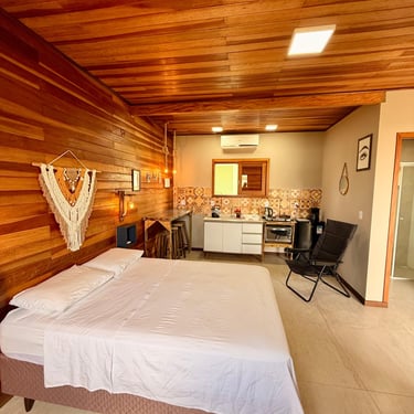 A apenas 90 metros do mar nossas suítes de 30 m² são muito bem equipadas com ar condicionado, Tv com Streaming e uma cozinha completa.